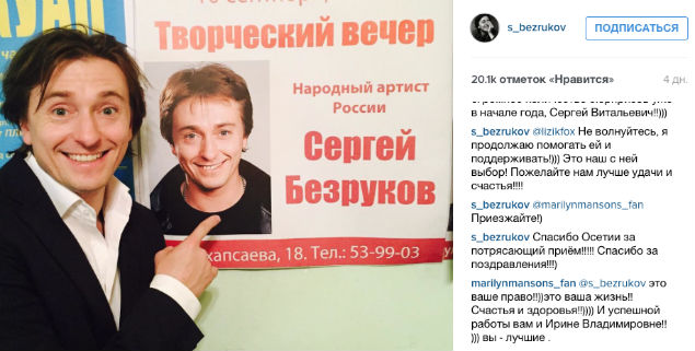 На странице Безрукова появился снимок, где артист изображен на фоне афишы своего творческого вечера. В комментариях актер поблагодарил всех зрителей, пришедших на встречу с ним. Поклонники тут же откликнулись и стали задавать вопросы своему кумиру. Прежде всего их интересовала информация о расставании с женой.
