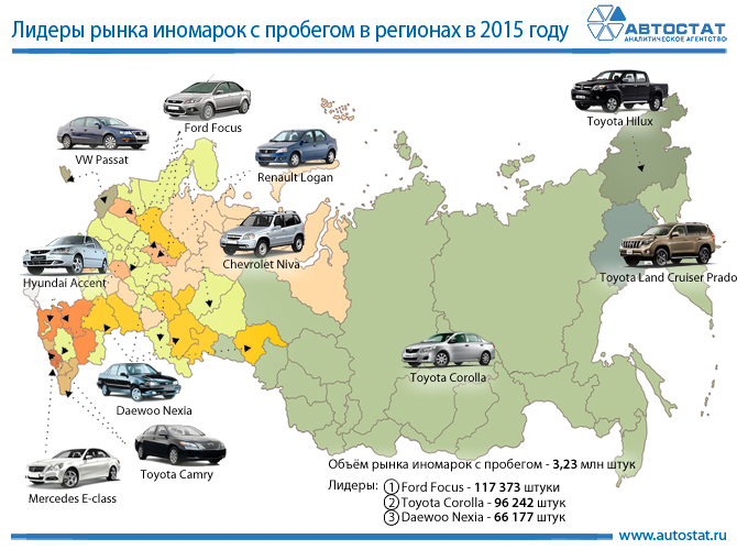 В разных регионах предпочтения автолюбители отдают различным автомобилям. Самым популярным подержанным автомобилем Ford Focus стал в 28 регионах, еще в 21 регионе лидирует Toyota Corolla, в 8 первую строчку занимает Daewoo Nexia. В пяти регионах на первое место выбился Renault Logan, а в четырех - Toyota Camry.