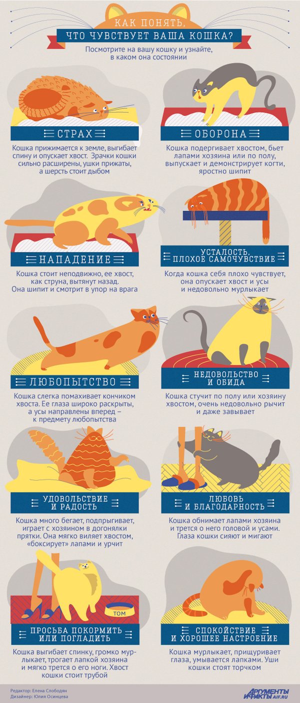 Для того, чтобы люди могли лучше понять своего домашнего питомца, была составлена инфографика, на которой объяснены основные позы и движения кошек.