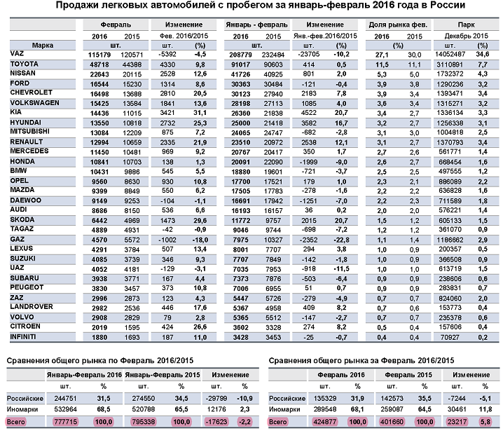 За два первых месяца 2016 года продажи автомобилей LADA с пробегом составили 208779 штук, что ниже продаж за аналогичный период прошлого года на 10,2%.
