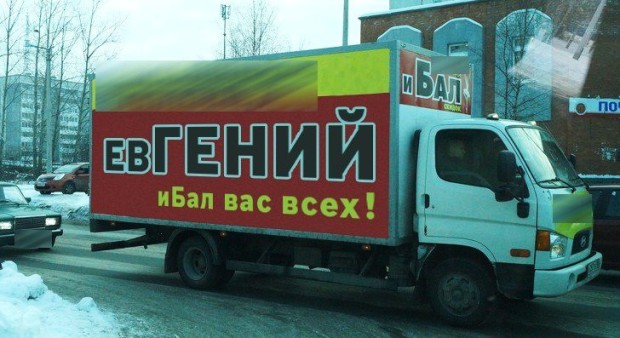 В поле зрения корреспондентов попала фотография грузового автомобиля, занимающегося перевозкой товаров одного из гипермаркетов Петрозаводска. Рекламный ход,видимо, оказался весьма сложным: «тот глагол, про который можно подумать при первом прочтении, на самом деле оказывается странным сочетанием букв, указывающим на «БАЛ скидок» в магазине».
