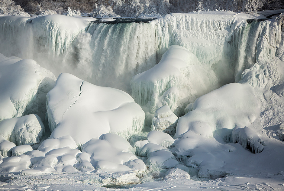 Это только третий случай в истории, когда Ниагарский водопад постностью покрылся льдом, образуя живописный ледяной рельеф. Происходит эта аномалия раз в столетие, предыдущие «заморозки» Ниагары случились в 1848 и 1912 годах. В прошлом году журналисты сообщали о замерзании водопада, но это оказалось не совсем правдой: вода замерзла лишь частично.