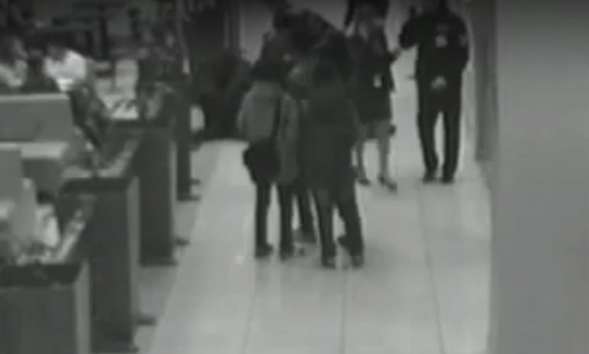 Вероятно, чтобы угомонить мужчину, потребовалась физическая сила. Как видно на записи на помощь охранники подоспели еще пятеро его коллег. На видео видно, что мужчина лежит на полу в окружении шестерых охранников.