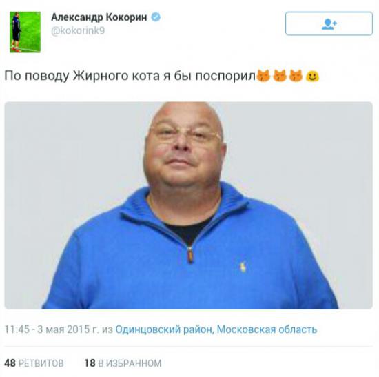 Нападающий сборной России и московского "Динамо" Александр Кокорин дал свой ответ бывшему владельцу "Спартака" Андрею Червиченко, разместив фото в своём твиттере с подписью "По поводу Жирного кота я бы поспорил".