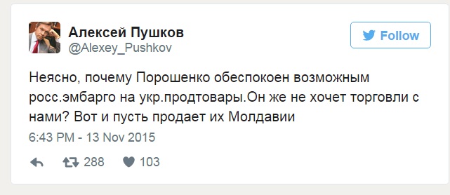 "Он же не хочет торговли с нами? Вот и пусть продает их Молдавии", - заявил на своей странице в Твиттере Пушков.