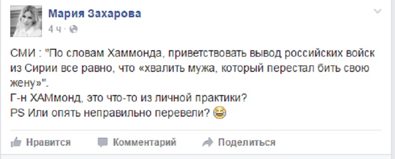 «Г-н Хаммонд, это исходя из Вашей личной практики? Или снова неправильно перевели?», - написала Захарова.