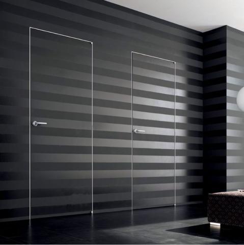 Двери вмонтированы в стену на одном уровне. Пи этом дизайн дверей можно вбирать самому - либо в цвет стены, либо какой-то отдельный декор.