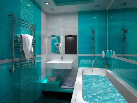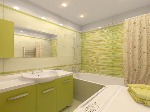 Можно сделать в ванной яркие пятна - вставки плитки другого цвета, например. Чтобы "поднять" потолок, сделайте на нем контрастного цвета фризы.