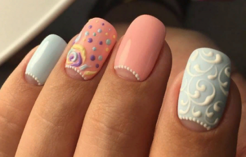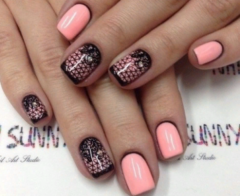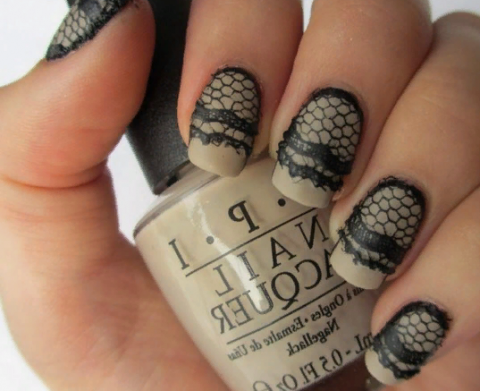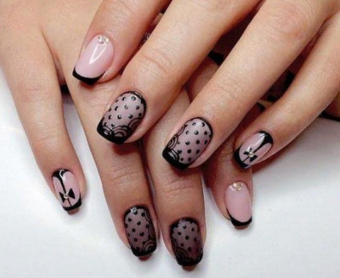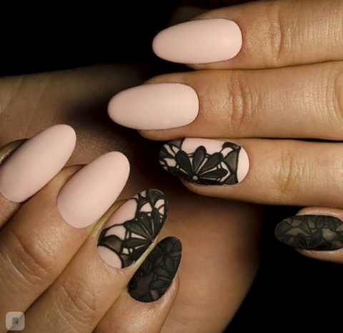 Если вам хочется сделать эффектный маникюр, то черное кружево в сочетании с пастельными оттенками лака придаёт рукам нежность и изысканность.