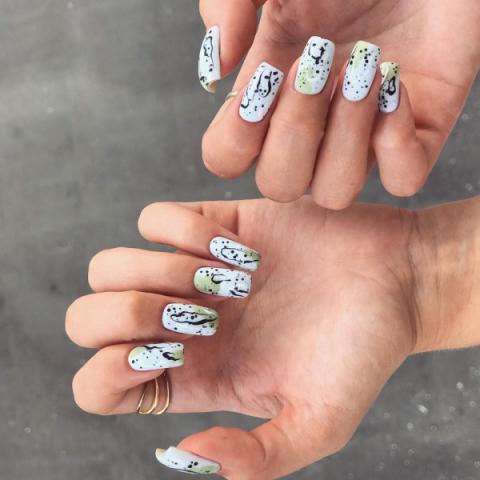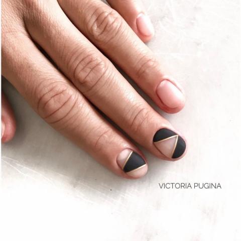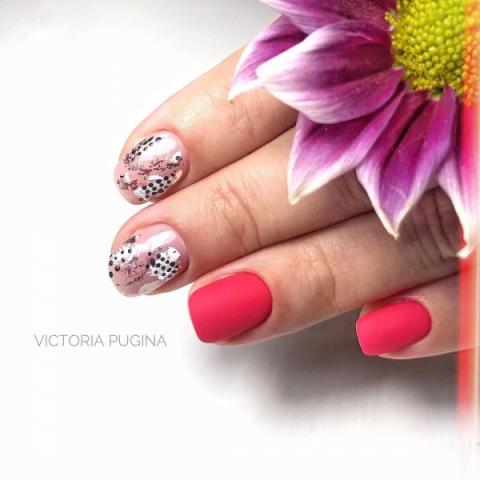 В моде абстракция и минимализм, интересный дизайн получится, если поэкспериментировать с листочками, цветами, точками и линиями на акцентных ноготках.