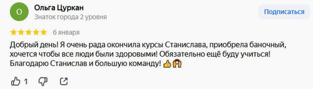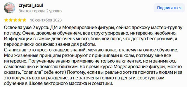 Если с отрицательными отзывами редакция разобралась быстро, то на анализ положительных комментариев в Сети потребовалось достаточно много времени. Курсы Станислава Чернонога пользуются популярностью. Нам удалось обнаружить упоминания о Школе Векторного Массажа и Соматики на таких интернет-площадках: ИнфоХит – 25 положительных отзывов, Яндекс.Карты – 69 оценок, рейтинг 4,9.
