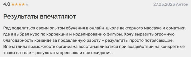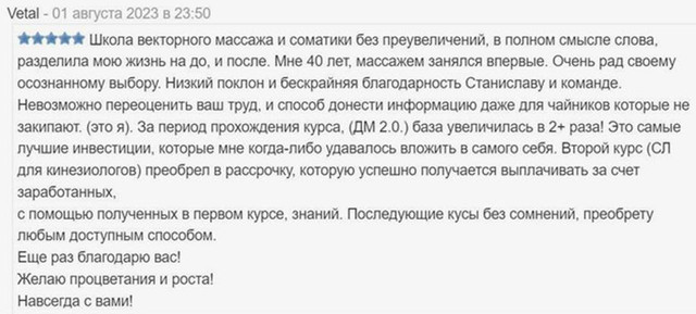 Недолгие поиски, и мы вышли на несколько отзывов, подходящих под требования. В них ученики Станислава делятся, что смогли без проблем найти себе клиентов уже в процессе обучения или сразу после получения сертификата. Многие изучали векторный массаж и соматику для себя и своей семьи.