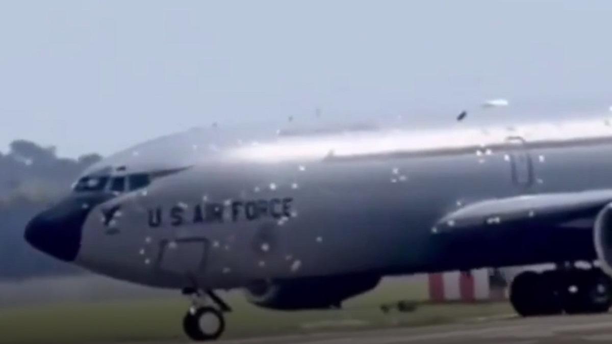 Продырявленный иранской ракетой самолет США KC-135 сняли на видео
