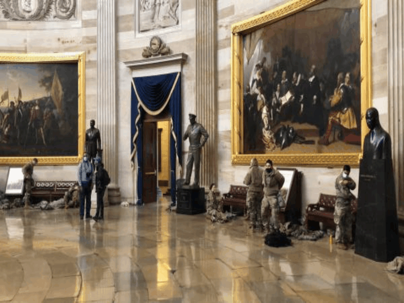 В соцсетях подняли на смех и осудили американских военных, охраняющих здание Капитолия от протестующих, которые устроили беспорядок в одном из зданий-символов США. На опубликованных фотографиях видно как военнослужащие раскидали по зданию вещи, обмундирование и даже оружие, а сами спокойно отдыхают, где придётся. Эти снимки послужили поводом для осуждения в интернете как самого бардака в Капитолии, так очевидно и такого же беспорядка, царящего в армии США. Пользователям социальных сетей не понравилось поведение американских военных и нелестные отзывы получили не только сами военнослужащие, но командование американской армии.