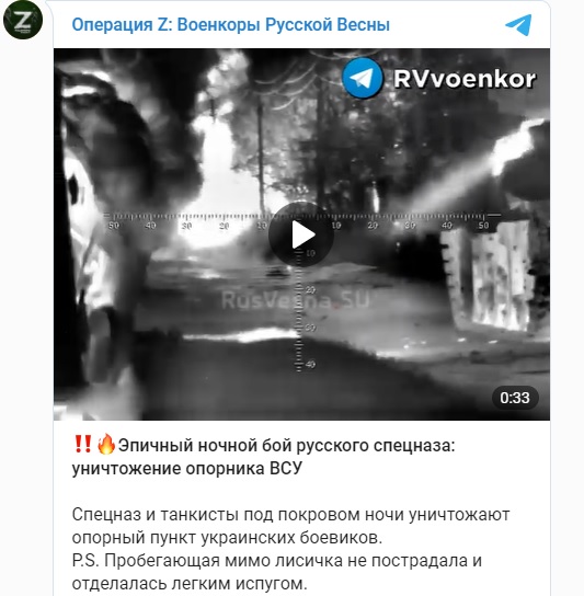«Эпичный ночной бой русского спецназа: ликвидация опорного пункта ВСУ. Спецназ и танкисты под покровом ночи уничтожают опорный пункт киевских военных», - отметили военкоры издания.