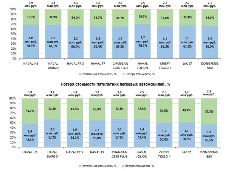 Спустя пять лет эксплуатации лидером по сохранности остаточной цены по сравнению с ценой нового авто оказался Changan CS35 Plus. Реализовав пятилетний автомобиль, владелец имел возможность приобрести новый, доплатив 42,1% от его изначальной цены.