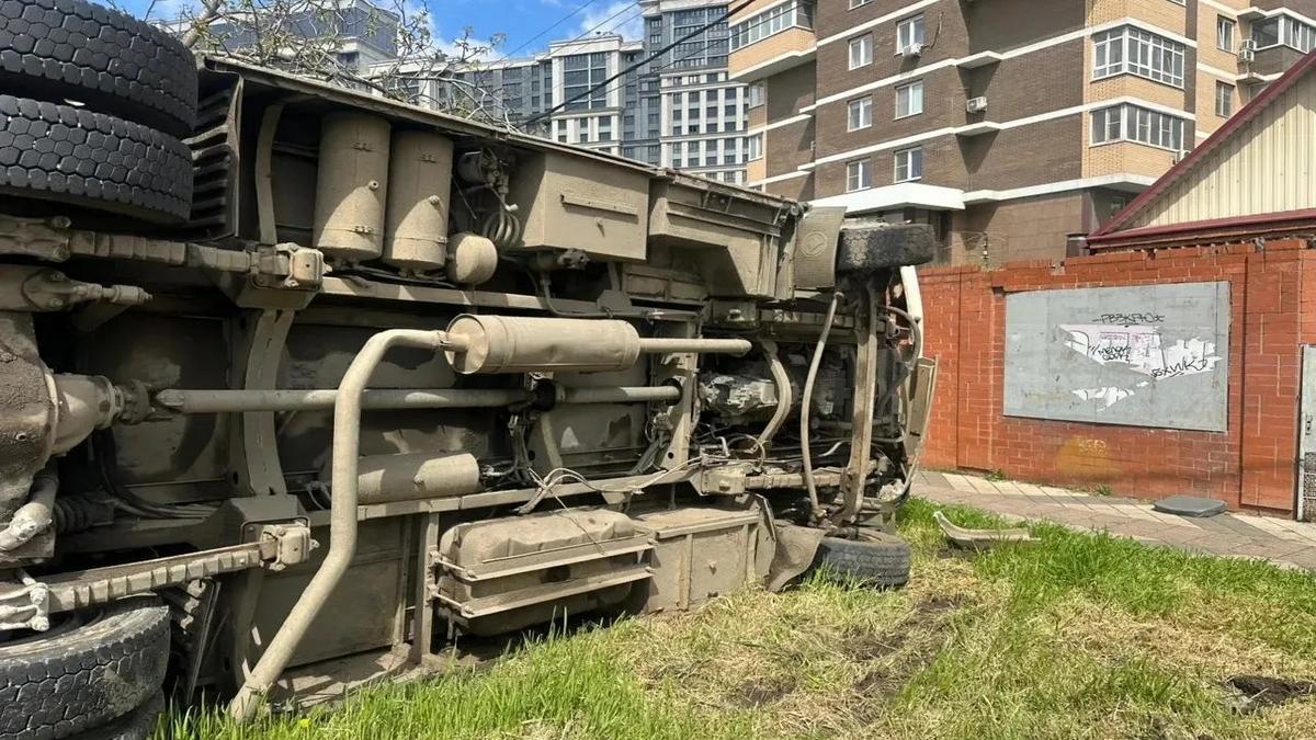 В Краснодаре произошло ДТП с вахтовым автобусом. Транспортное средство, в котором находились 9 пассажиров, опрокинулось на бок.