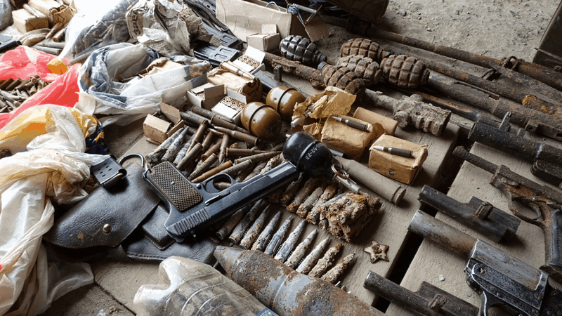 Среди изъятого десятки карабинов, винтовки Мосина, автоматы, гранатометы, ручные гранаты, тысячи патронов, дымовые шашки, холодное оружие военного времени. Кроме того, изъяты послевоенные образцы оружия – автоматы Калашникова.