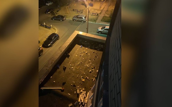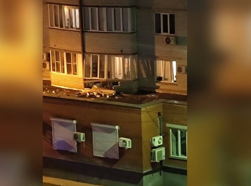 На представленных кадрах видно, что в квартире на втором этаже дома выбиты стекла и вылетела москитная сетка. На козырьке подъезда присутствуют обломки, которые вынесло из квартиры ударной волной.