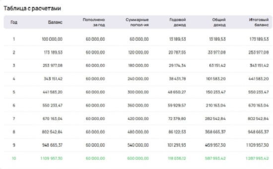 Кажется, что 10 лет — это большой срок. Но учитывая, как бежит время и каковы долгосрочные цели, понятно без объяснений, почему нужно использовать сложный процент. Стоит отметить, что мы ежегодно прибавляли к 100 тысячам до 60 тысяч на протяжении 10 лет — и при сравнительно невысокой доходности по консервативным ставкам добились итогового дохода в 587 с лишним тысяч. На приведенной ниже формуле мы видим, от чего зависит действие сложного процента, то есть сумма, которую мы получим за определенный отчетный период.