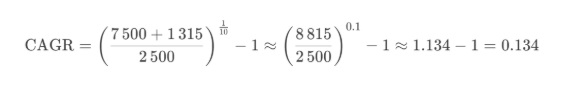 Подставляем: начальная цена (2014) — 2 500 ₽ конечная цена (2023) — 7 500 ₽ сумма дивидендов за 10 лет: 60 + 70 + ... + 220 ≈ 1 315 ₽ Количество лет (n) — 10