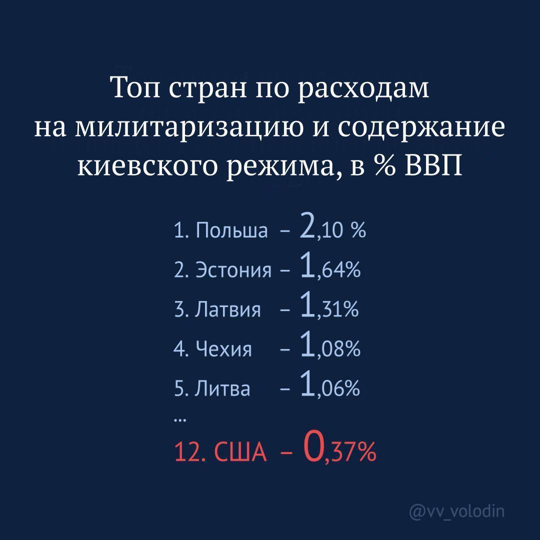Спикер Госдумы РФ Вячеслав Володин привел цифры, наглядно показывающие, как США воюют с Россией за чужой счет. По объему поддержки, выделяемой Украине, Соединенные Штаты стали только 12-ми.