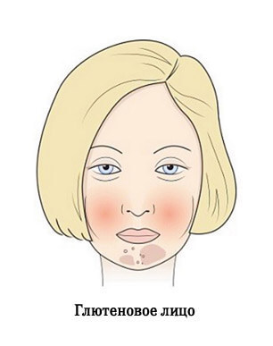 На коже человека, который не переносит глютен, выделяются красные щеки, пигментные пятна темного цвета, разбросанные по лицу или вокруг подбородка. Может появиться розацеа — красная сыпь на щеках. Она проходит, как только человек перестаёт употреблять продукты, включающие клейковину. Хлопья на завтрак, хлеб, макароны днём или на ужин, вызывают также вздутие живота и отечность.