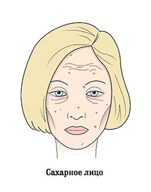Если ваша пища богата углеводами и сахаром, то на лбу появляются линии и морщины и мешки под глазами, лицо принимает измождённый вид. Кроме этого, по всему лицу, а возможно, и по всему телу высыпают прыщи и появляются болезненные пятна. Кожа истончается и становится бледно-серого оттенка.