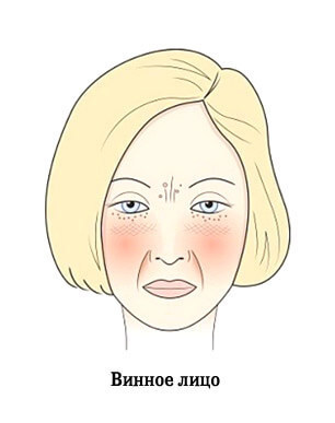 У людей, выпивающих каждый день, появляются выраженные линии или покраснение на переносице, веки обвисают, расширяются поры, кожа обезвоживается, и на щеках появляются капилляры. Краснеют щёки и нос, резко выделяются носогубные складки.