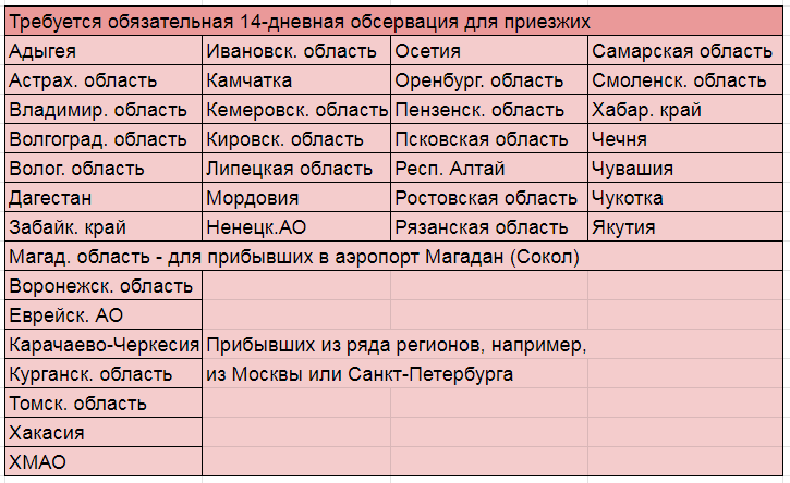 И наконец, несколько регионов, в которых обязателен двухнедельный карантин для всех приезжих.