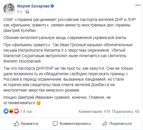Официальный представитель МИД РФ Мария Захарова прокомментировала заявление министра иностранных дел Украины Дмитрия Кулебы, назвавшему российские паспорта для жителей ЛНР и ДНР «филькиными грамотами».