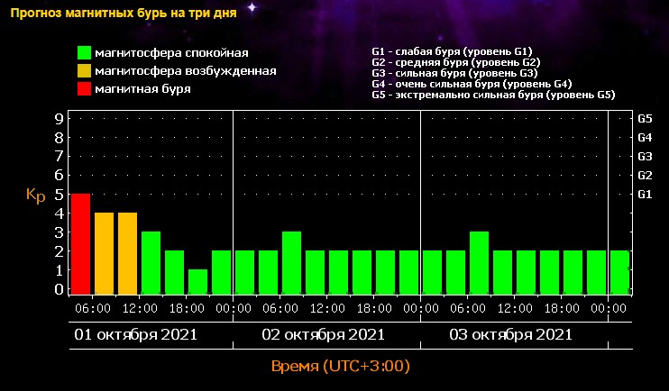 Итак, согласно прогнозу, опубликованному на сайте лаборатории, октябрь 2021 года обещает быть вполне спокойным в плане геомагнитных колебаний. Магнитная буря будет лишь в первый день месяца, то есть 1 октября.