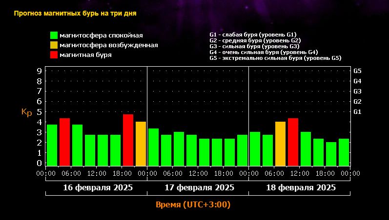 На протяжении дня 16 февраля специалисты не прогнозируют всплесков. Однако к вечеру геомагнитная обстановка вновь станет неспокойной. Очередная магнитная буря ожидается к 18.00 час. Длиться она будет также порядка трех часов. После 21.00 час. она начнет стихать. Однако магнитосфера будет возбужденной до полуночи.