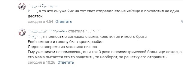 Жители Кандалакши характеризуют 15-летнего подростка как "маньяка и убийцу". По сообщениям пользователей Сети, имеет место случай, когда он избивал беременную учительницу в школе. Жители Кандалакши, активно обсуждающие происшествие в соцсети ВК, говорят о том, что были неоднократные избиения сверстников со стороны задержанного, и делятся подробностями жизни подростка.