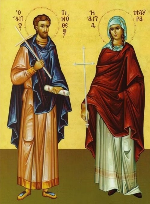 Тимофей и Мавра - молодые супруги, жившие в III–IV веках. Оба были носителями христианской веры, за что были подвергнуты истязаниям. Тимофей отказался предавать веру, а Мавра напротив, поддалась. Но муж смог переубедить ее и в итоге она последовала за ним в вере. Супругов распяли. Девять дней они находились на крестах, а на десятый день предали души Господу.