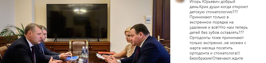 Губернатору Астраханской области Игорю Бабушкину, под каждым постом в соцсетях пишут гневные комментарии, с требованием возобновить деятельность в нормальном режиме стоматологий и больниц.