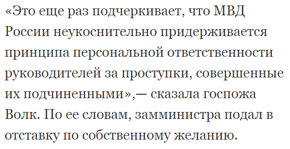 По словам Ирины Волк, МВД РФ неукоснительно следует принципу персональной ответственности. «Коммерсант» цитирует её комментарий.