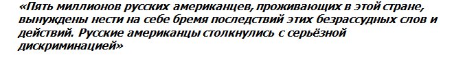 Дошло до того, что глава Конгресса русских американцев Наталья Сабельник направила письмо на имя президента США Дональда Трампа. В нем она сообщает, что русские американцы не поддерживают антироссийскую истерию и русофобию, развернутую западными СМИ: