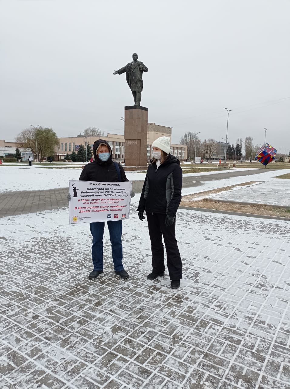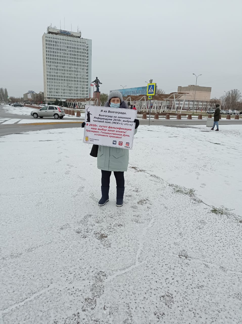 22 ноября от ЦУМа до гостиницы Ахтуба жители провели одиночные пикеты в поддержку волгоградского времени. Они говорят, что «их гнев праведный», а власти «в преддверии выборов 2021 года затеяли опасную игру в наперстки».