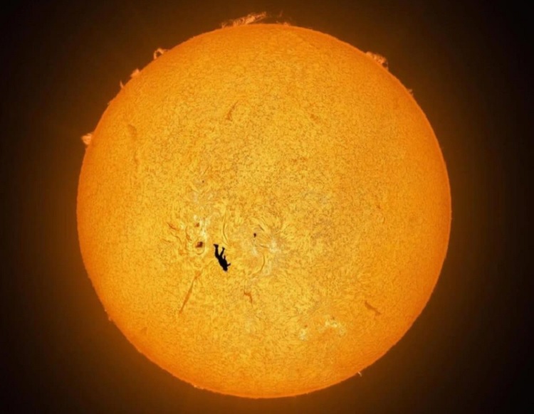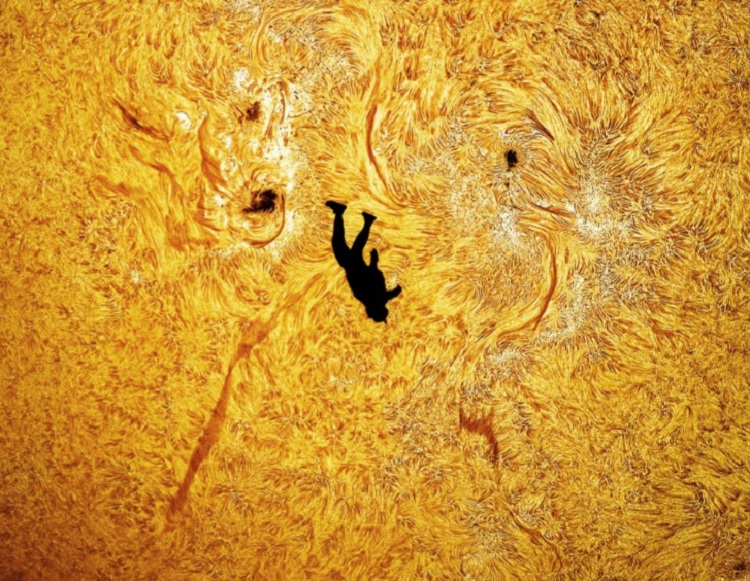 Астрофотограф Эндрю МакКарти заснял парашютиста на фоне солнечного светила. Он пояснил, что для получения снимка использовал специализированный телескоп H-alpha. Фото обладает уникальным эффектом - на нем человек словно падает внутрь Солнца.