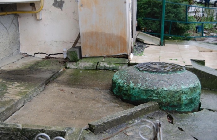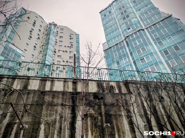 В микрорайоне Малый Ахун в Сочи жители нескольких многоквартирных домов больше года наблюдают проседание грунта и трещины в подпорных стенах. Девятиэтажный дом 1991 года постройки располагается на склоне, его козырьки подпирают металлическими трубами, чтобы предотвратить обрушение.