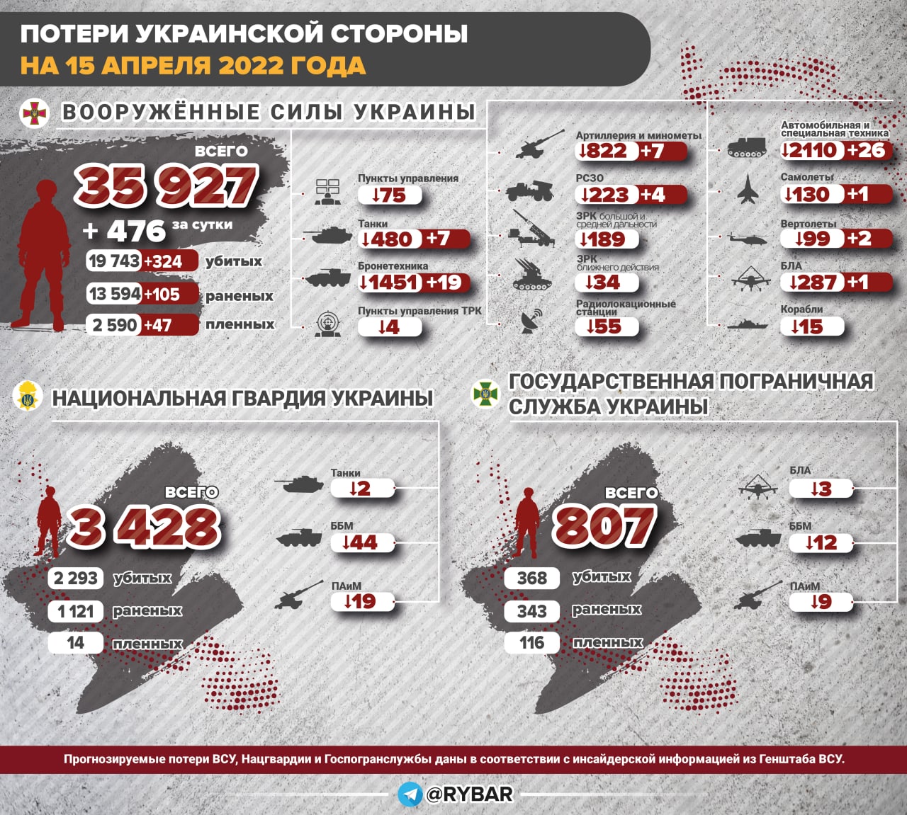 Сведения Зеленского разительно отличаются от информации, имеющейся у Минобороны РФ. Военные эксперты, опираясь на сводки оборонного ведомства, делают выводы о том, что с начала конфликта Украина потеряла порядка 35 тысяч военных. Ниже приводим данные tg-канала Рыбарь, которые совпадают с тем, что озвучивает большинство военных аналитиков.