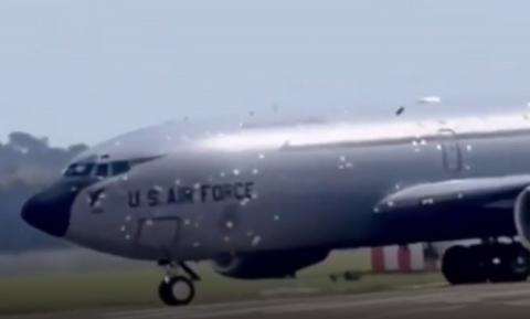 Самолет-заправщик США KC-135R Stratotanker получил удар иранской баллистической ракетой с кассетной боевой частью. Весь изрешеченный шрапнелью он сумел добраться до базы в Великобритании.